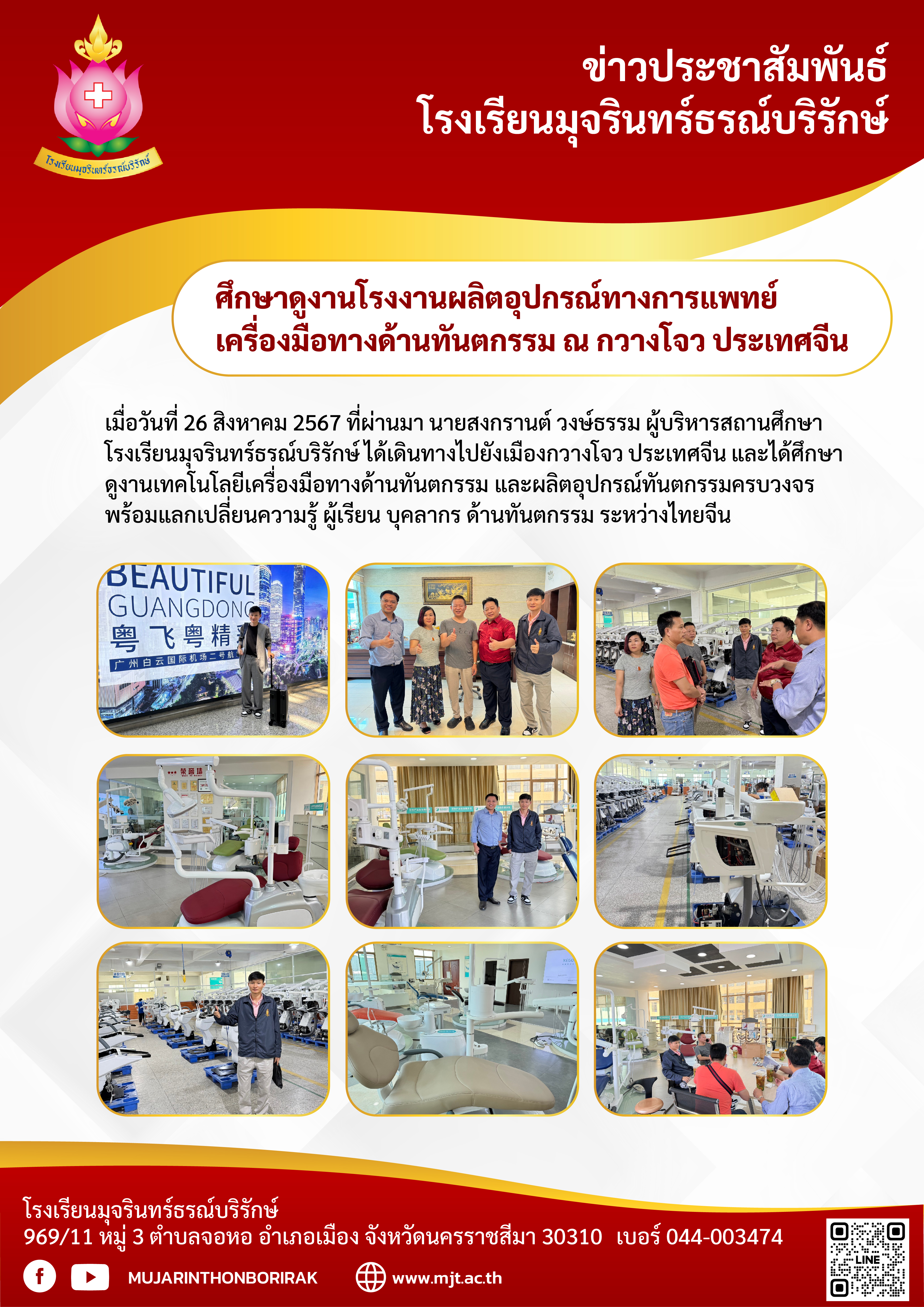เมื่อวันที่ 26 สิงหาคม 2567 ที่ผ่านมา นายสงกรานต์ วงษ์ธรรม ผู้บริหารสถานศึกษาโรงเรียนมุจรินทร์ธรณ์บริรักษ์ ได้เดินทางไปยังเมืองกวางโจว ประเทศจีน และได้ศึกษาดูงานเทคโนโลยีเครื่องมือทางด้านทันตกรรม และผลิตอุปกรณ์ทันตกรรมครบวงจร พร้อมแลกเปลี่ยนความรู้ ผู้เรียน บุคลากร ด้านทันตกรรม ระหว่างไทย จีน